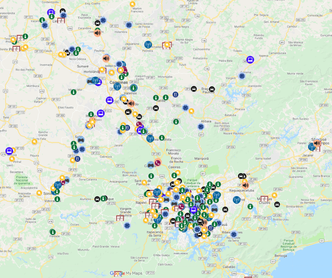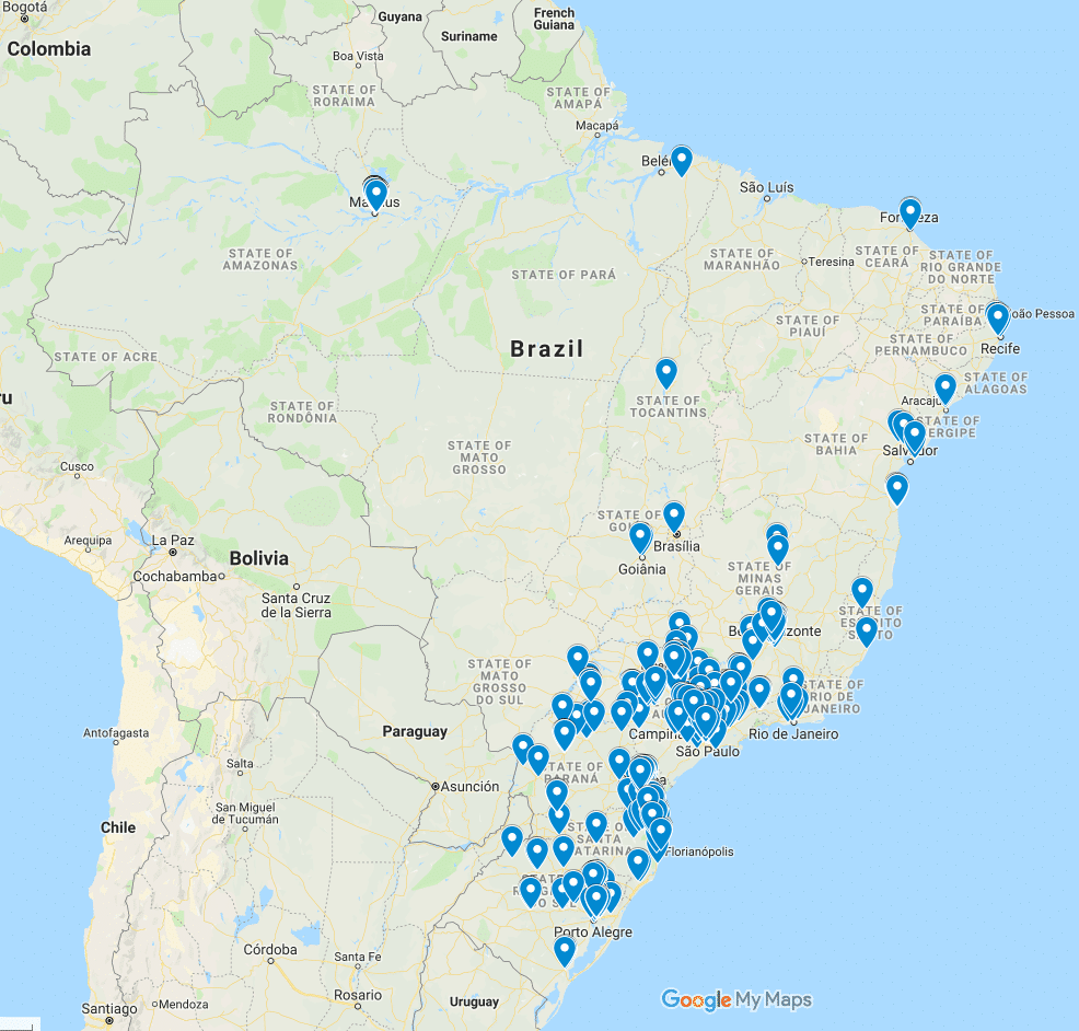 Através da lista e do serviço mymaps do Google, foi criado um mapa com a localização das empresas. O link para o mapa está aqui. Uma versão sem classificação de empresas por CNAE primário pode ser vista na Figura 3.