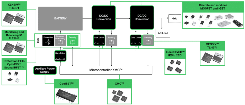 O sistema de conversão de energia (PCS) lida com a conversão AC/DC e DC/AC, com a energia fluindo para as baterias para carregá-las ou sendo convertida do armazenamento da bateria em AC e alimentada na rede. As soluções de comutação de energia adequadas dependem das tensões suportadas e do fluxo de energia. Além disso, o sistema de gerenciamento de bateria (BMS) lida com o carregamento, equilíbrio e saúde das células.