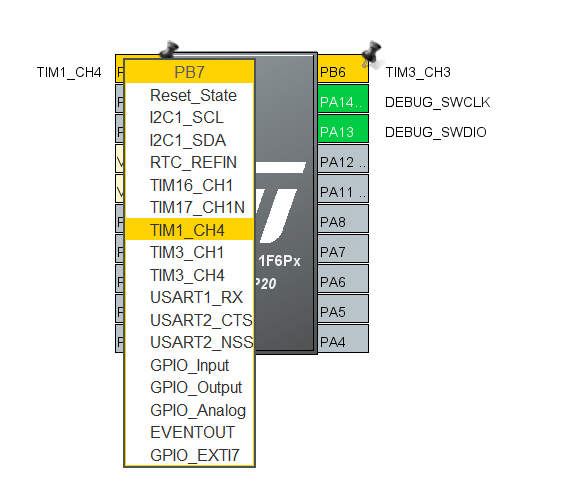 - Clique sobre o pino “PB7” e selecione “TIM1_CH4”.