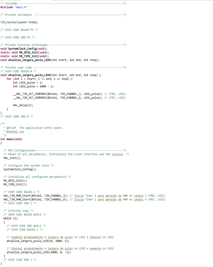 void atualiza_largura_puslo_LEDS(int start, int end, int step);- Agora, no loop principal while, dentro de int main, adicione o seguinte: