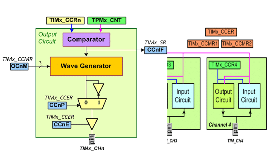 - Quando a contagem atinge o ARR, o pino de saída do canal é colocado em nível ALTO.