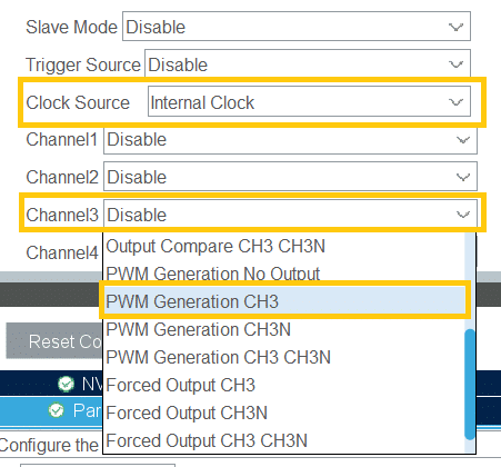 - Em “Timers”, selecione “TIM1”. Habilite a fonte de clock como “Internal Clock”. Para o Channel 3 e Channel 4, selecione “PWM Generation”. Defina o valor do Prescaler para 48-1 e o Counter Period para 1000-1.