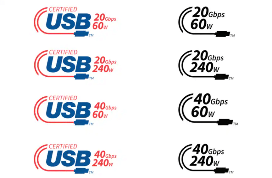 En 2021, el USB Implementers Forum (USB-IF) publicó logotipos actualizados de clasificación de potencia para cables USB Tipo-C certificados, con el fin de especificar las capacidades de potencia de los cables USB-C para los consumidores. Los cables USB Tipo-C certificados llevan ahora logotipos (Figura 4) que destacan la compatibilidad con 60 W o 240 W de potencia, según lo definido por la recientemente publicada USB Power Delivery.