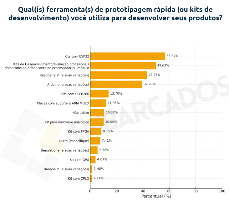 Conforme o Relatório da Pesquisa sobre o Mercado Brasileiro de Sistemas Embarcados e IoT 2025, a Espressif e o ESP32 se destacaram, ocupando as primeiras posições em diversas categorias. Entre elas, estão: