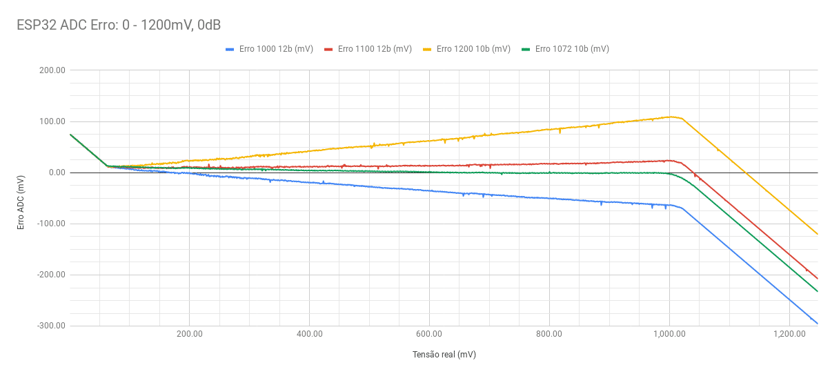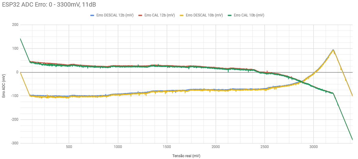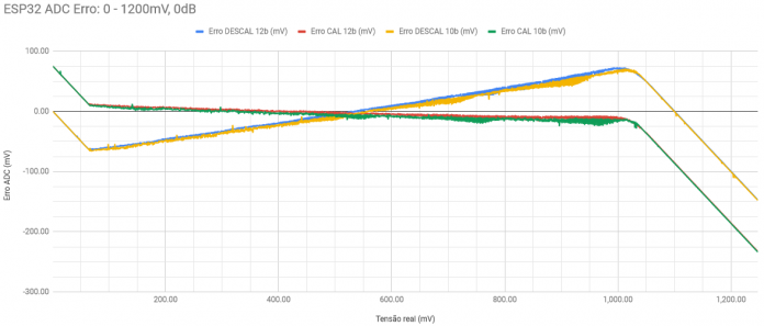 Apesar do erro com a calibração tendendo a ~0 mV na faixa de tensão recomendada pela Espressif (100 – 950 mV), fora desses limites, o erro é grande e pode ser totalmente inaceitável, descartando essas leituras em muitos projetos.