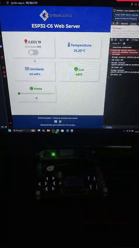 Com a página HTML disponibilizada no IP do navegador. O Websocket se conecta ao servidor (ESP32-C6-DevKit-C) e o servidor retorna as informações para a página.