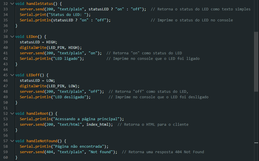 Ao acionarmos o botão de ligar ou desligar o LED na Web, chamamos a função toggleLed que gerencia qual ação a ser tomada. As funções ligarLED e desligarLED, seguem a mesma lógica de atualizarStatus.