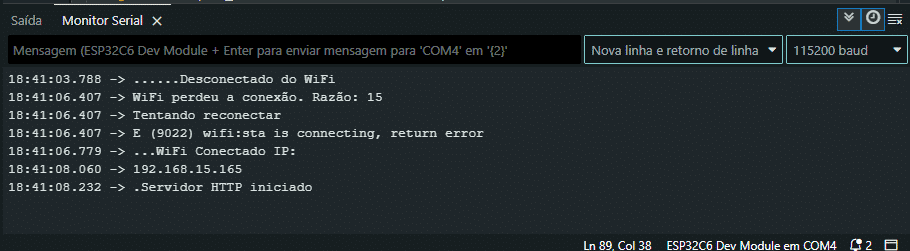 Para acompanhar o funcionamento do projeto, abra o monitor serial e verifique as etapas de criação do servidor. Abaixo, você encontrará o endereço IP da placa conectada.