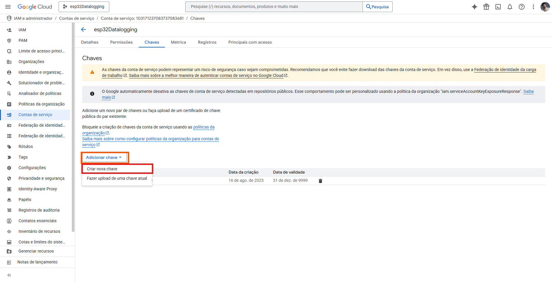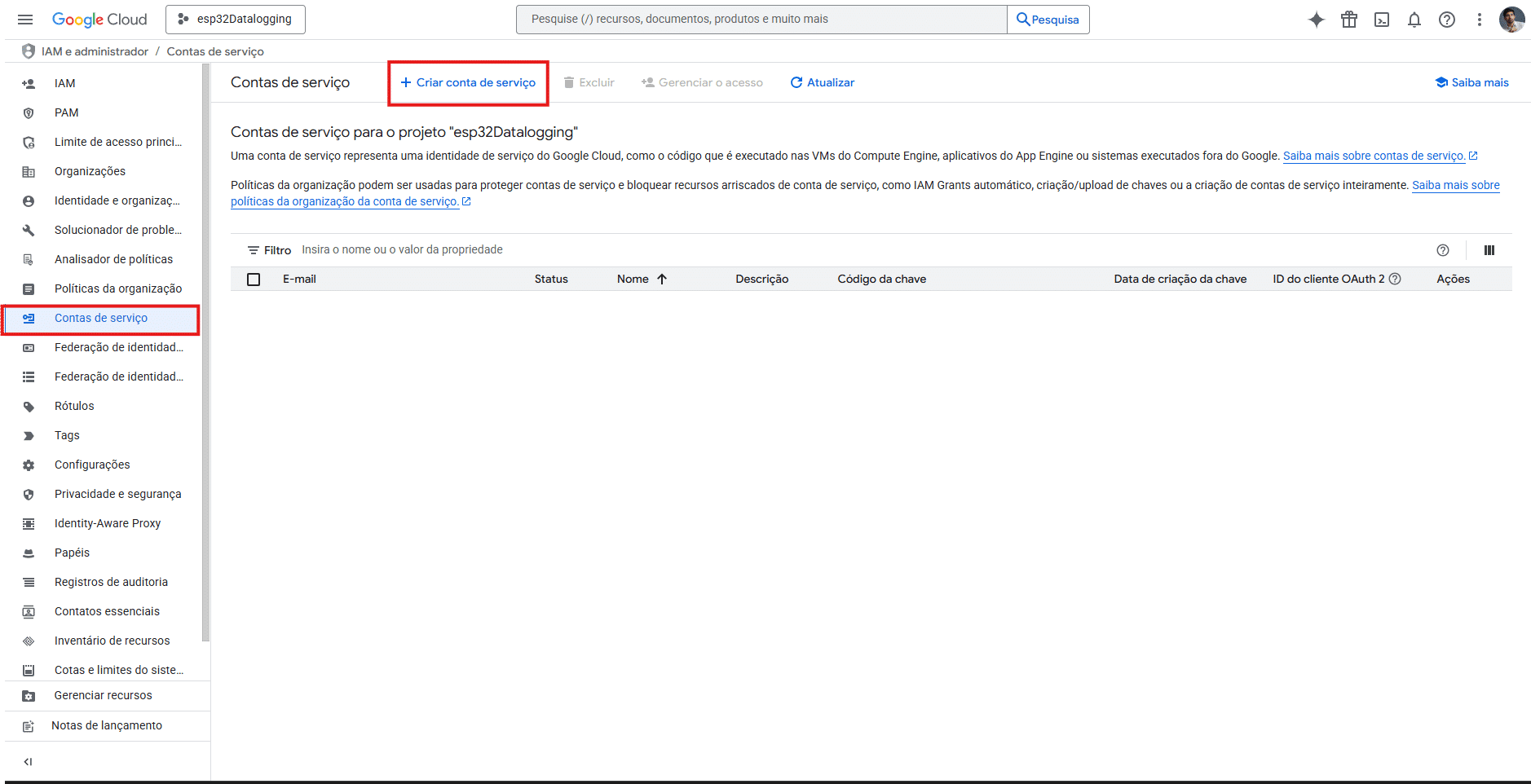 - Na barra lateral esquerda, clique em Contas de serviço e Criar conta de serviço