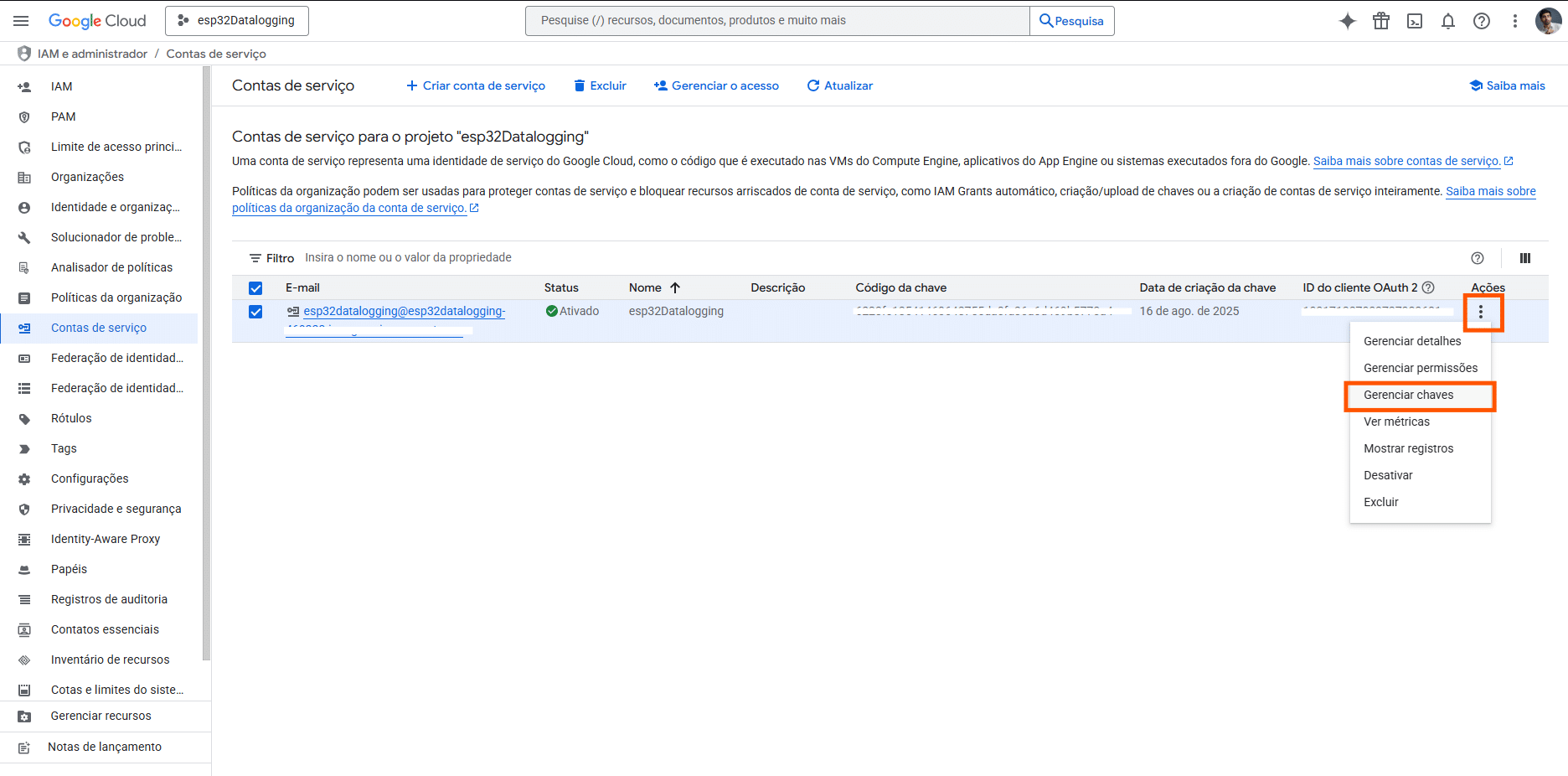 - Selecione o projeto, clique no ícone de três pontos e clique em Gerenciar chaves.
