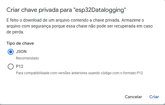 - Em seguida, selecione JSON e clique Criar para baixar um arquivo JSON no seu computador com a chave.