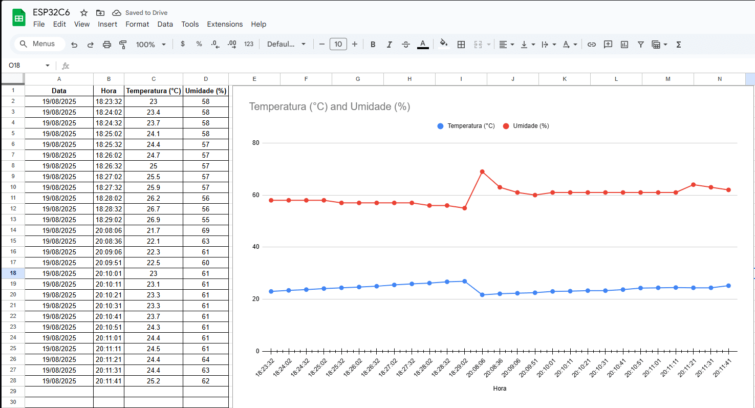 Abra a planilha onde você está publicando os valores. Você deve ver novos valores sendo publicados em tempo real. A primeira coluna contém a Data, depois a Hora, Temperatura em graus Celsius, e, finalmente, a Umidade em porcentagem.