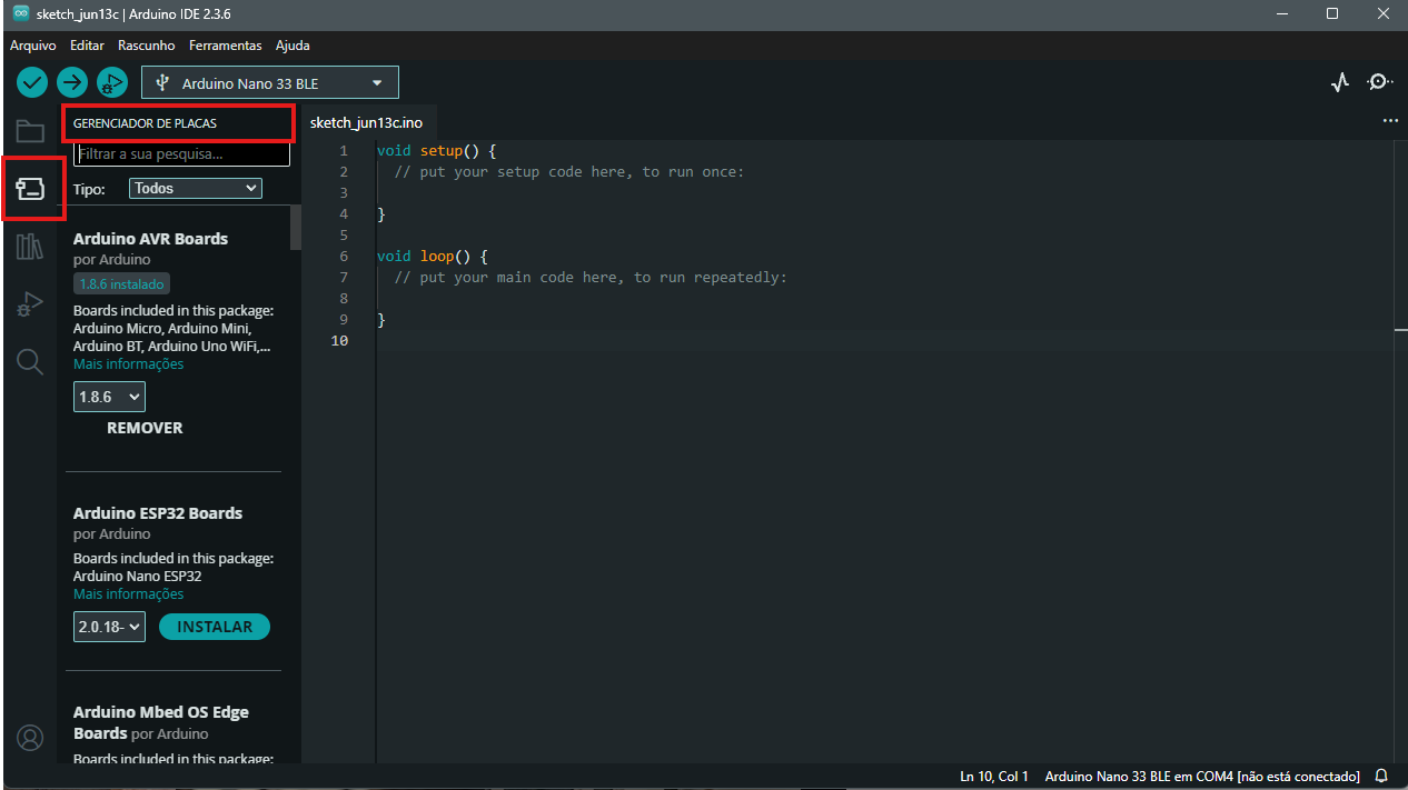 Para instalar o pacote oficial da Espressif para o ESP32 na Arduino IDE, utilizaremos a ferramenta Gerenciador de Placas, que já vem integrada à própria IDE.