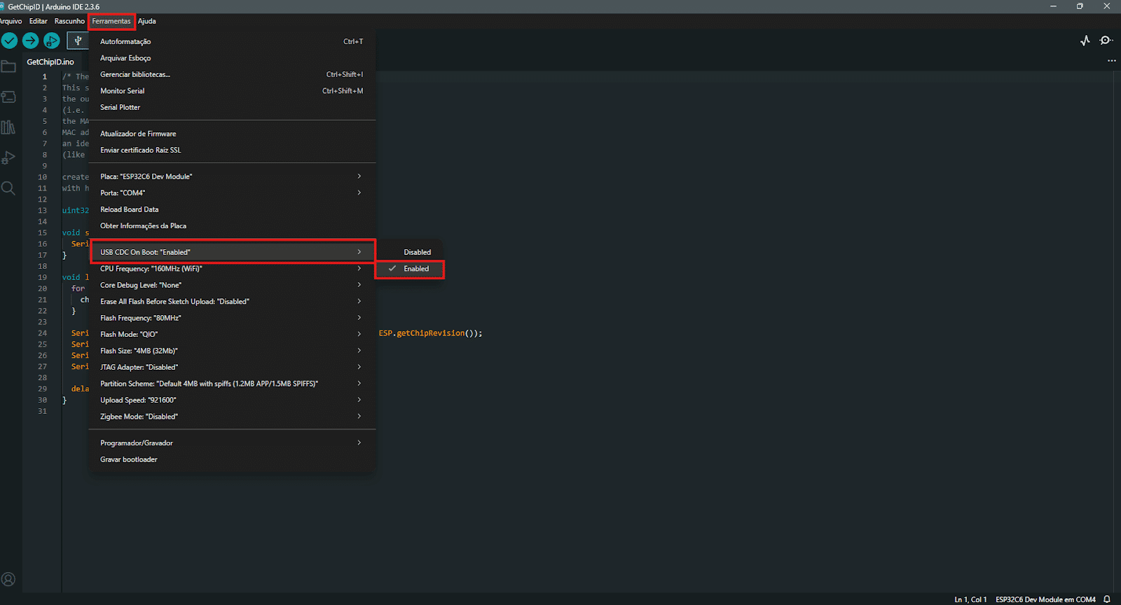 Para receber os dados no Monitor Serial, é necessário habilitar o USB CDC.