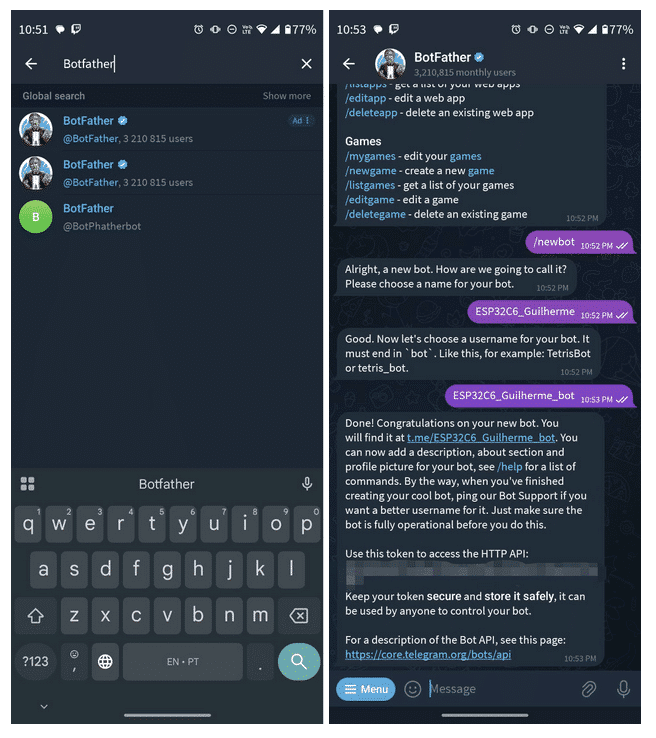 - Digite o comando /newbot e siga as instruções: