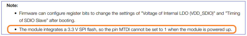 GPIO_12: Tensão do LDO interno do chip: Se este pino estiver desconectado (pull-down interno) ou com um nível lógico 0 na sua entrada durante a inicialização, o pino VDD_SDIO, que é uma saída de tensão de alimentação externa do chip, usado para alimentação de periféricos, terá tensão de 3V3 na sua saída. Agora se tiver com nível lógico 1, sua saída será de 1V8.
