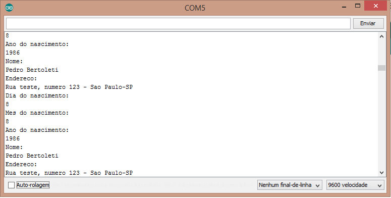 A saída de dados no vista no Serial Monitor é contínua (são repetidos os mesmos dados indefinidamente), e um fragmento da saída é exibido na figura abaixo: