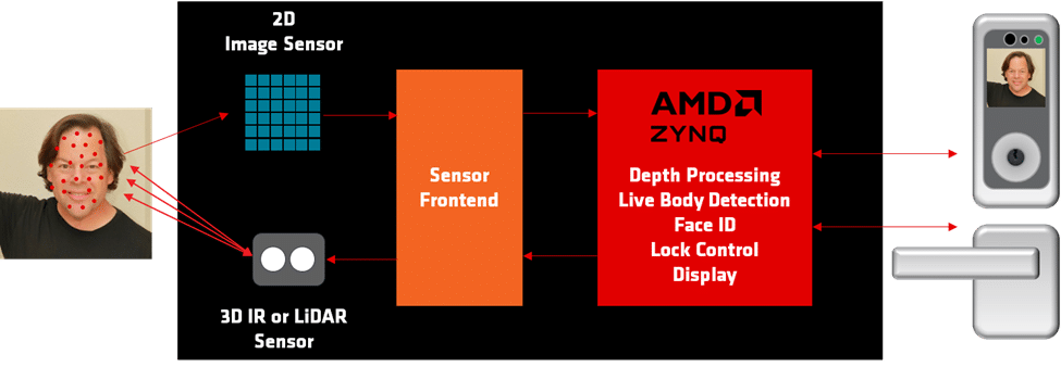 A AMD, em parceria com a Makarena, desenvolveu uma solução, com base no SoC AMD Zynq™ 7000, que oferece um design totalmente funcional e robusto usando reconhecimento facial 3D. Esse reconhecimento facial avançado é alcançado por meio de uma câmera que utiliza a tecnologia IR Time-of-Flight (TOF) ou Lidar para refletir um padrão no rosto da pessoa que tenta entrar, enquanto os sensores na fechadura inteligente capturam a reflexão (Figura 1).
