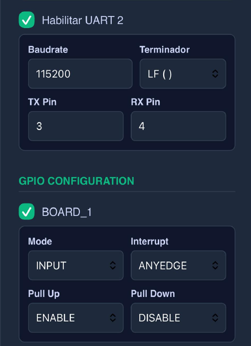 Pelo portal, o desenvolvedor pode habilitar as instâncias de UART, definir a taxa de transmissão (baud rate), o caractere delimitador de mensagem (‘\0’, NULL, ou ‘\n’, LF) e rotear digitalmente quais pinos atuarão como RX e TX. O mesmo se aplica aos pinos de GPIO, onde é possível habilitar interrupções, definir modos de operação e acionar resistores internos de pull-up ou pull-down. Essa abordagem maximiza a utilidade da ferramenta em laboratório, permitindo que ela se molde perfeitamente a diferentes equipamentos sob teste.