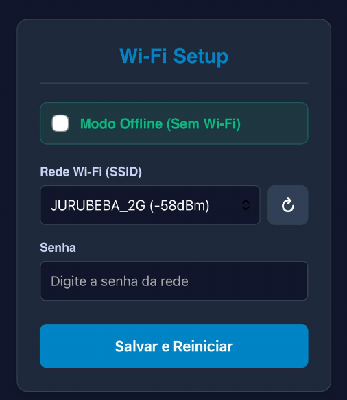 Nessa interface web, o usuário pode atualizar a lista de redes disponíveis, inserir o SSID e a senha, ou simplesmente assinalar a opção de “Modo Offline”. Essa funcionalidade garante que, na ausência de conectividade, a operação principal de data logging local no cartão SD continue funcionando de forma ininterrupta e confiável.