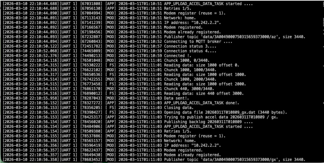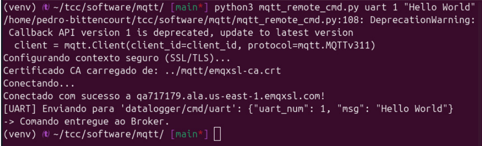 Monitoramento e Interação via MQTT: Scripts adicionais foram criados para realizar a subscrição e o envio de parâmetros. O script de subscrição permite monitorar no terminal do computador o fluxo de logs despachados pelo datalogger remotamente em tempo real. Já o de interação serve para injetar comandos remotos via publicação de mensagens, o que viabiliza, por exemplo, enviar comandos “AT” para um dispositivo em campo através da UART da ferramenta de diagnóstico.
