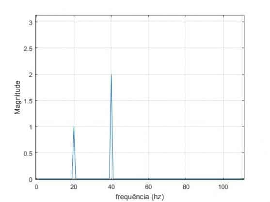 Através da transformada de Fourier é possível identificar a amplitude das duas componentes de frequência. Sendo assim, o sinal é formado por uma componente senoidal de frequência 20hz e amplitude unitária e outra de 40hz e amplitude igual a dois.