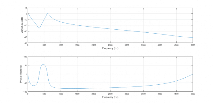 Novamente, é necessário que o nível DC seja mantido. Foi somado, então a este filtro um filtro passa-baixas com frequência de corte em 50hz, resultando na seguinte função de transferência: