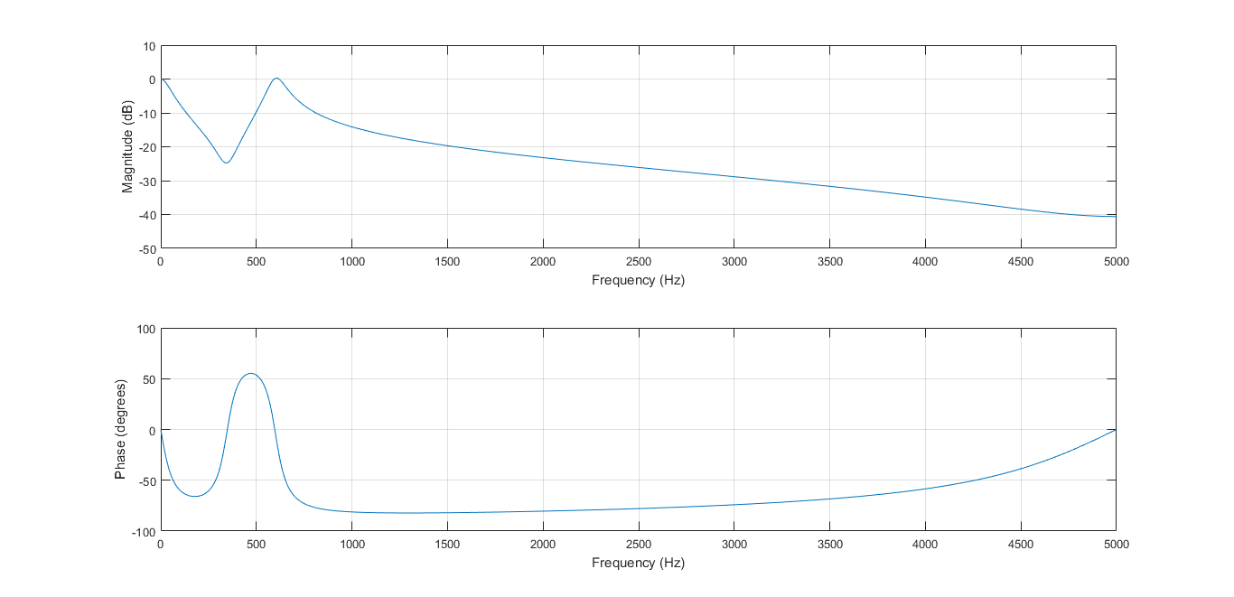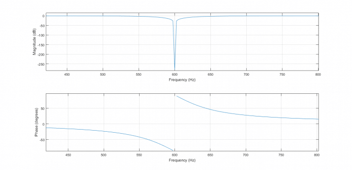 Foi projetado um filtro rejeita-faixa de primeira ordem com frequência central de 600hz, 100hz de largura de banda e frequência de amostragem igual a 10khz.