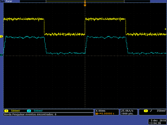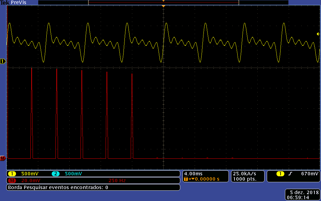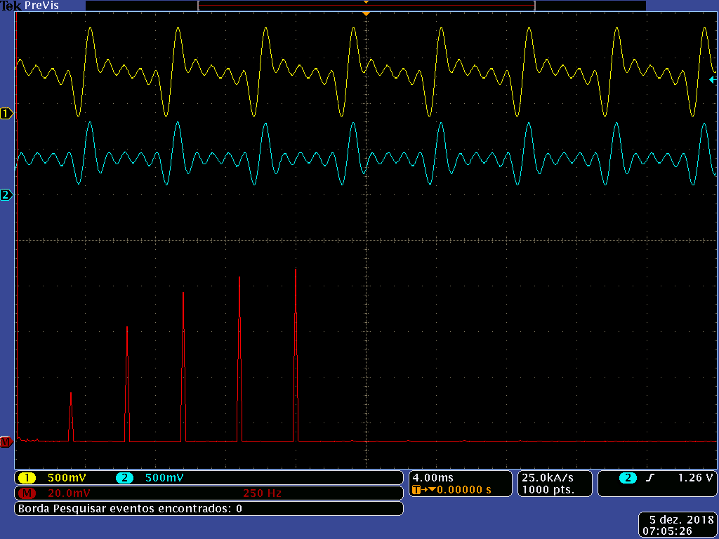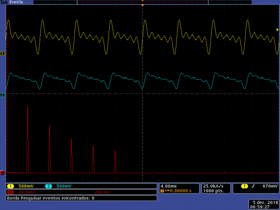 Foi configurado em um gerador de funções uma forma de onda com cinco componentes de frequência. Senoides com 200, 400, 600, 800 e 1000hz, além de um nível DC, já que os valores de tensão suportados pelos conversores analógico-digital e digital-analógico estão dentro do limite de 0 a 3,3V.