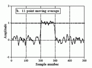 A redução do ruído é dada por , onde N é a ordem do filtro. As figuras a seguir ilustram a redução de ruído de um sinal utilizando dois filtros de ordem diferente.