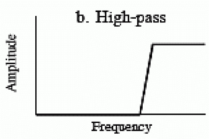 Os filtros passa-altas são aqueles os quais possuem ganho próximo a um para frequências acima da frequência de corte e atenuam aquelas frequências menores. A resposta em frequência destes sistemas é similar à apresentada a seguir:
