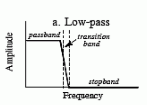Faixa de transição são aquelas frequências que estão entre os limites da banda de passagem e da banda de rejeição (). Frequência de corte é aquela em que o ganho é de . A partir desta, em filtros passa-baixa, as frequências são atenuadas. Em filtros passa-altas, são mantidas.