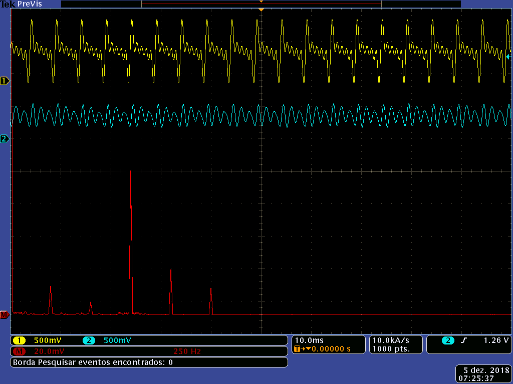Como a frequência de corte deste filtro está em 500hz, as componentes de frequência igual a 200 e 400hz tiveram suas amplitudes atenuadas significativamente como pôde ser observado. As componentes de 600, 800 e 1000hz também sofreram atenuação, mas não tão significante. Pode ser observado também que o nível DC manteve-se, como esperado ao somar à função de transferência do filtro passa-altas, um filtro passa-baixas.