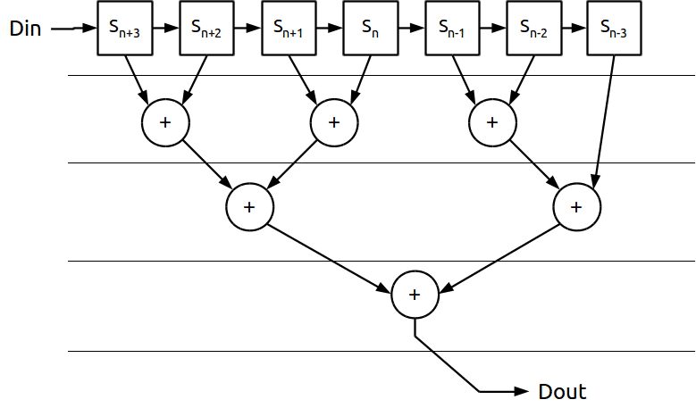 Cada adição seria implementada num nível lógico. No exemplo iríamos ter 3 níveis de lógica, o que reduziria a frequência máxima de operação do filtro pelos tempos de propagação.