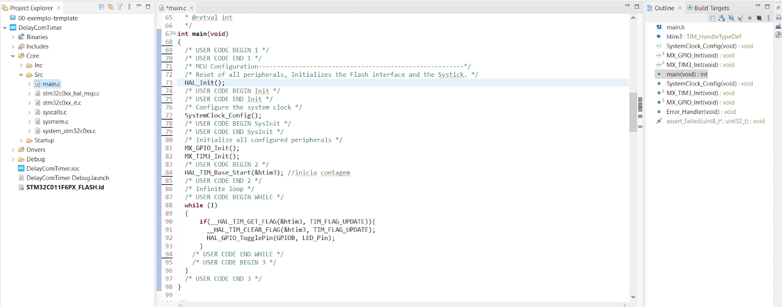 Nesse exemplo, nosso objetivo é piscar um LED, conectado ao PB6, a cada 0,5s (500ms) utilizando a criação de atraso com o Timer 3.