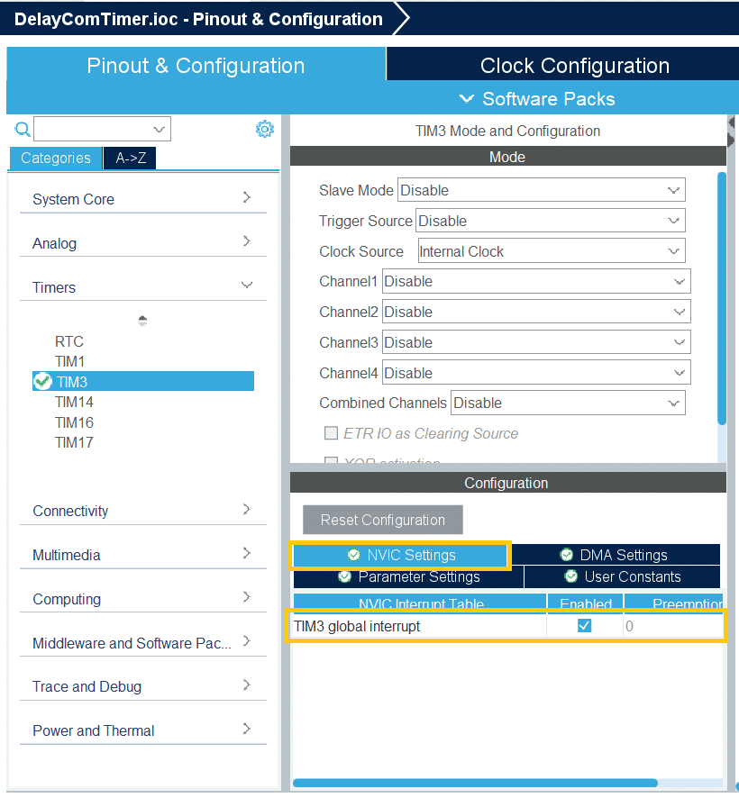 - Mantenha todas as configurações feitas no exemplo 01, modificando apenas um detalhe: em TIM3, vá em “NVIC Settings” e habilite a interrupção.
