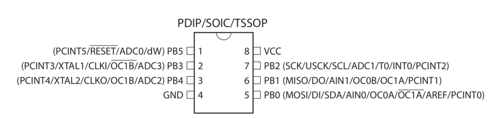 Conforme exibido na imagem acima, temos os seguintes pinos disponíveis no ATtiny85: