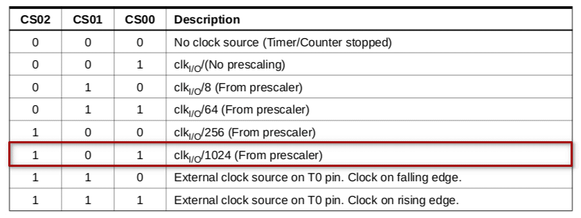 Para ajustar o prescale precisamos configurar os bits CS02,CS01 e CS00 do TCCR0B: