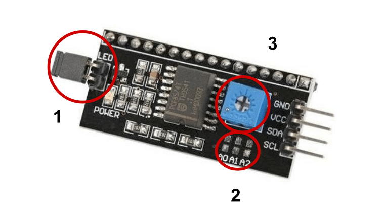 Observe na parte posterior do display temos o módulo I2C o qual vai facilitar a comunicação entre a Franzininho WiFi e o display LCD. Abaixo temos a imagem mostrando cada elemento.