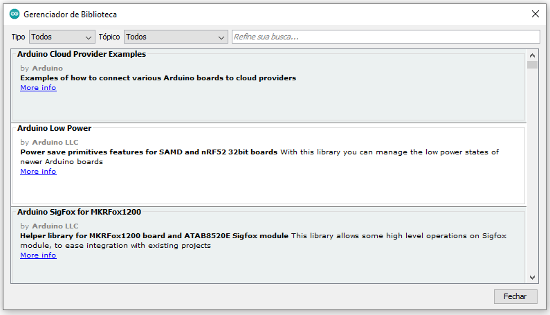 O código exemplo desenvolvido possui uma estrutura simples e direta. Para instalar a biblioteca na IDE do Arduino, deve-se acessar Ferramentas (Tools) > Gerenciar Bibliotecas. Será aberta uma janela (Figura 5) que irá carregar os índices e atualizado algumas bibliotecas já presentes. Ao finalizar, insira no campo de texto o nome Franzininho e logo será carregado a biblioteca para instalação (Figura 6) e clique em instalar.