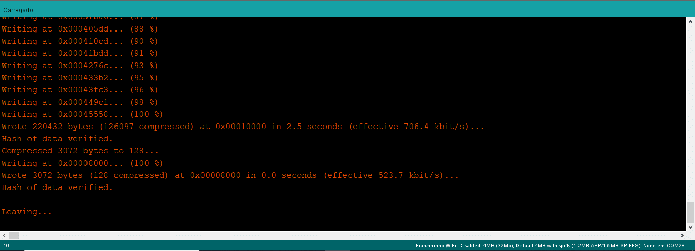 Após realizar a inclusão da biblioteca, a próxima etapa é a compilação do código e envio para a placa Franzininho WiFi. Segue a imagem abaixo de como deve ser a saída de dados na IDE do Arduino (Figura 8).