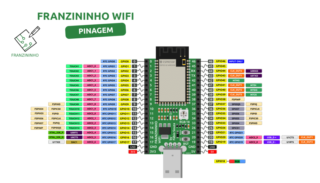 A Franzininho WIFI possui 20 entradas de ADC, sendo que o ADC1 possui 10 canais configurados do GPIO1 ao GPIO10, já o ADC2 possui 10 canais configurados do GPIO11 ao GPIO20(ver pinout abaixo). O conversor analógico-digital da ESP32-S2 que iremos utilizar possui 12bits de resolução, portanto, ele lê a tensão e a converte em um número entre 0 a 4095. A função adc1_get_raw() irá fazer a captura da quantidade de tensão aplicada ao pino do canal configurado.