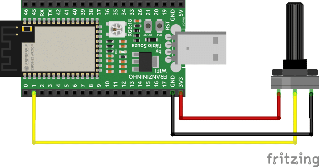 Conecte os três fios do potenciômetro à sua placa. O primeiro fio vai de um dos pinos externos do potenciômetro para o GND. Já o segundo vai do outro pino externo do potenciômetro para 3,3 Volts. E por último, o terceiro vai do pino do meio do potenciômetro ao pino analógico GPIO1.