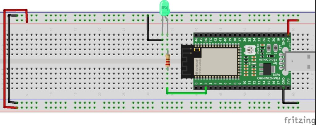 Antes de começarmos a escrever as primeiras linhas de código vamos realizar a montagem do circuito, vale ressaltar que na placa Franzininho WiFi há um LED RGB on board endereçável, contudo será utilizado um LED externo, conectado a GPIO 2, para o primeiro projeto, vamos nos familiarizarmos com os comandos básicos. Abaixo segue o esquemático proposto :