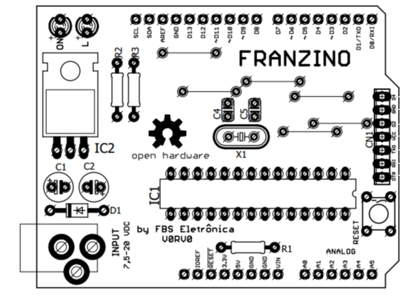 A Franzino foi desenvolvida no Eagle e publicada sob a licença CC BY-SA 4.0. Acesse os arquivos no github, reproduza, compartilhe com seus amigos, contribua com melhorias para a placa.