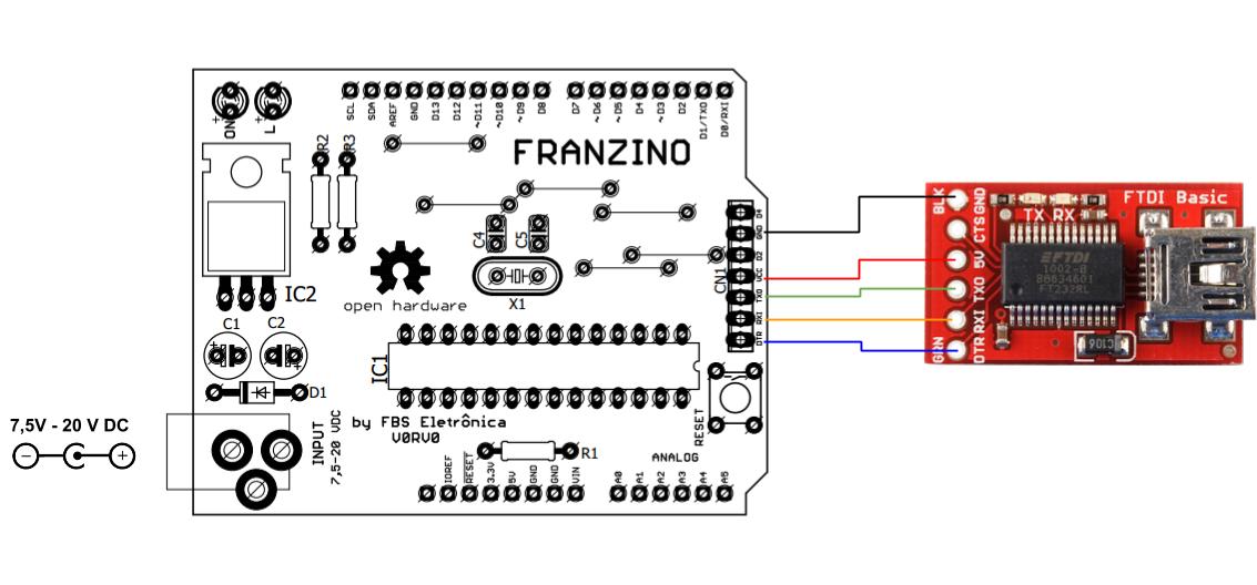 O circuito da Franzino é bem simples e possui os componentes básicos para uso do microcontrolador ATmega328, ou outros compatíveis. A figura a seguir exibe o circuito:
