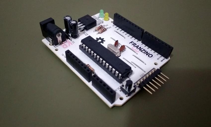 A placa Franzino é uma placa tipo standalone, e como seu próprio nome sugere, é uma placa enxuta que possui os componentes básicos para que você possa usar o microcontrolador ATmega328, tanto para estudo quanto para a aplicação em projetos.