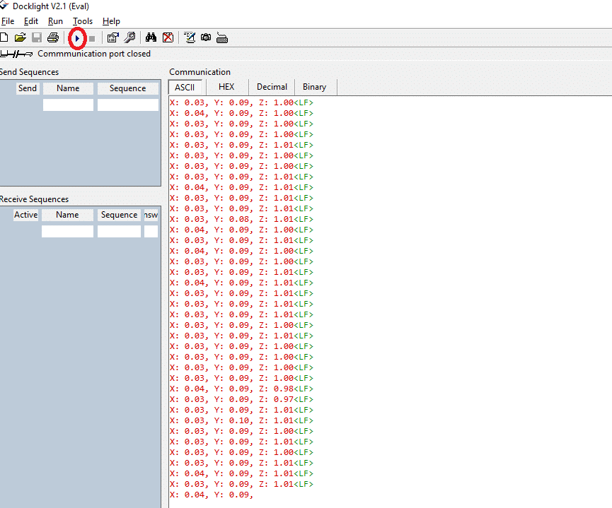 Clique em “Ok” e em seguida clique na seta de “play” para que então os dados do acelerômetro sejam impressos no computador de acordo com a figura 12.