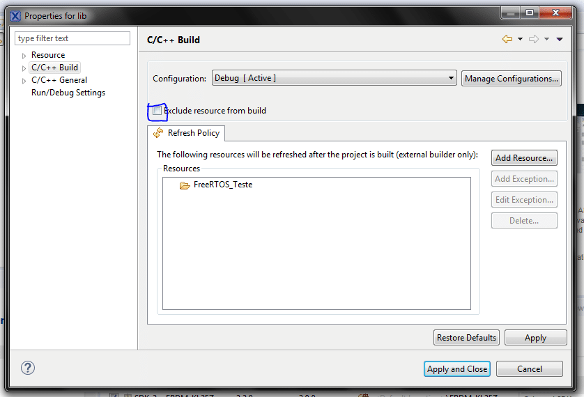 Para ter certeza que estes arquivos serão compilados, clique com o botão direito sobre a pasta recém importada → Properties → C/C++ Build e desmarque a caixa “Exclude resource from build”.