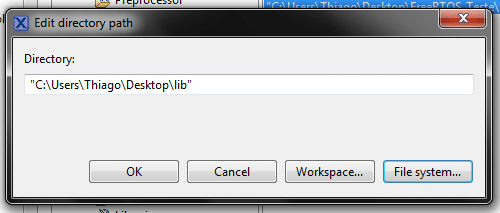 O diretório contendo o header (.h) deve ser incluído nas configurações de compilação do projeto clicando com o botão direito sobre ele → Properties → C/C++ Build → Settings → MCU C Compiler → Includes. Clique no ícone “Add…” no canto superior direito e digite o endereço da biblioteca ou navegue utilizando o explorador de arquivos.